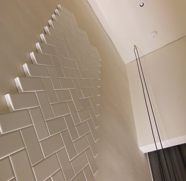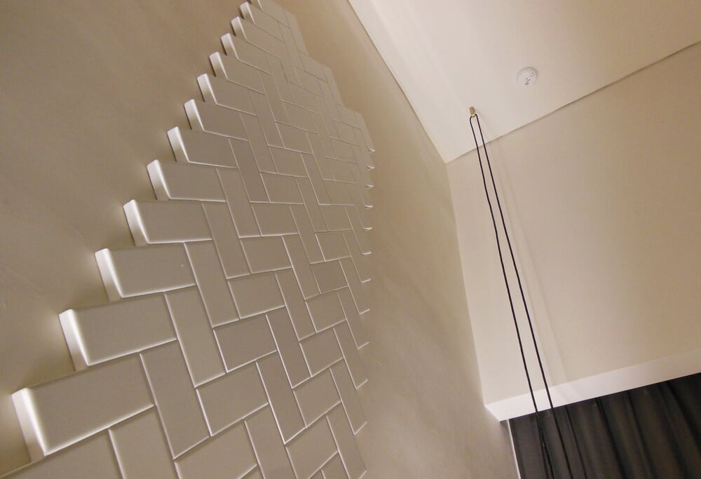 El sutil tejido negro sobre la pared del vestíbulo parece textura del mismo muro. Se observa una ligera trama irregular, con azulejos brillantes y mates.